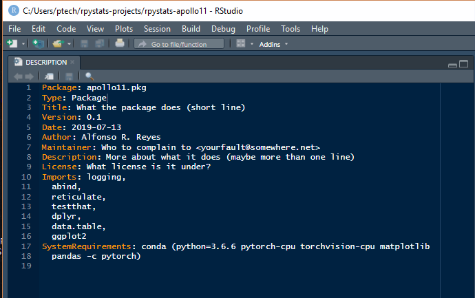 In R, the DESCRIPTION file defines the capabilities of the package. Here we enter the R libraries, and Python libraries, that will be required for the application. After entering these library definitions save the file.