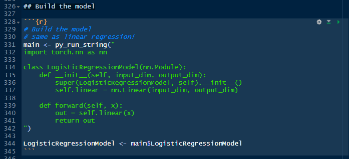The following chunk will serve us very well because it represents the confluence of Python and R. The class that is being defined here is named *LogisticRegressionModel*. This is the algorithm that will be used to train the model. This class is inheriting from another class: Linear, which is part of the torch.nn library. We will just add a method to the class, forward(), before we finish. What it is interesting here is that the machine learning class is entirely written in Python, not in R. I will not explain now why is has to be that way in this episode. The class (code in green), is then assigned to the *main* object in R, and immediately extracted from main itself, to an R object named *LogisticRegressionModel*, same as its relative in Python. Note that we used the dollar sign *$* to extract an object from main. This *$* sign is how you extract objects in R, while in Python we use the dot, like in *nn.Linear*.