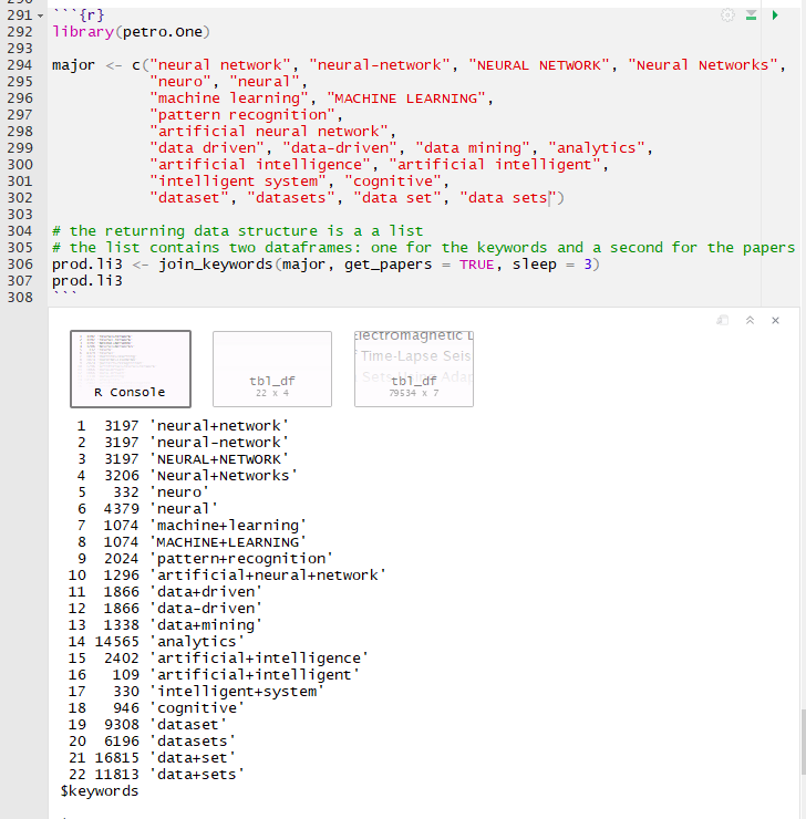 This is a search of papers using R, #rstats, and the package petro.One. You could see that “neural network”, “neural-network, and”NEURAL NETWORK“, return the same number of papers: 3197. The same with”data driven" and “data-driven”. This makes the paper search much more efficient and fast. Maybe a little tweaking more on the root of the words like in the case of “neural networks” vs. “neural network”; they should be the same (stem). But it is so close: a difference of 9 papers over 3197.