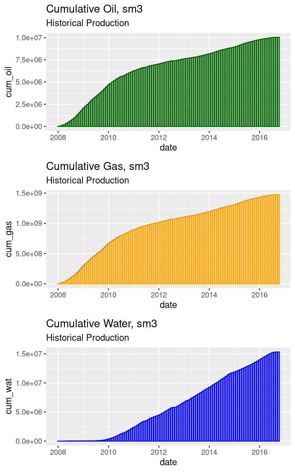 ggtitle("Cumulative Oil, sm3", subtitle = "Historical Production")