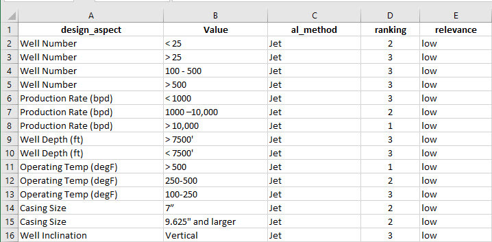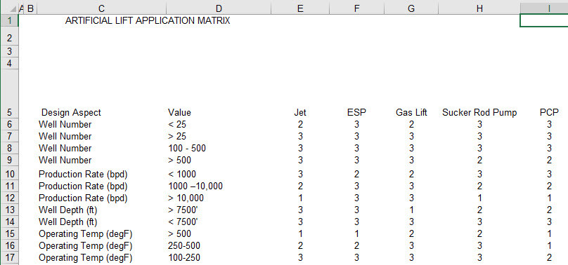 Inspired by a post by Fernando Ruiz at LinkedIn on an Artificial Lift tool this morning, I decided to dust off an old Excel workbook containing an old matrix with various design aspects of artificial lift.