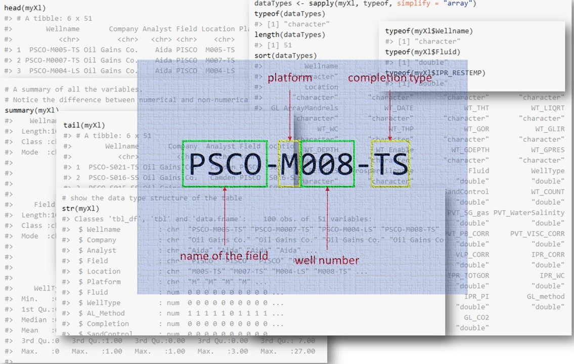 Transforming Excel well raw data into datasets This section is about getting familiar with our data. We will be using functions to know the size of our table or data frame, the names of the columns or variables, the structure of the data and the type of data for each of the variables or columns.
