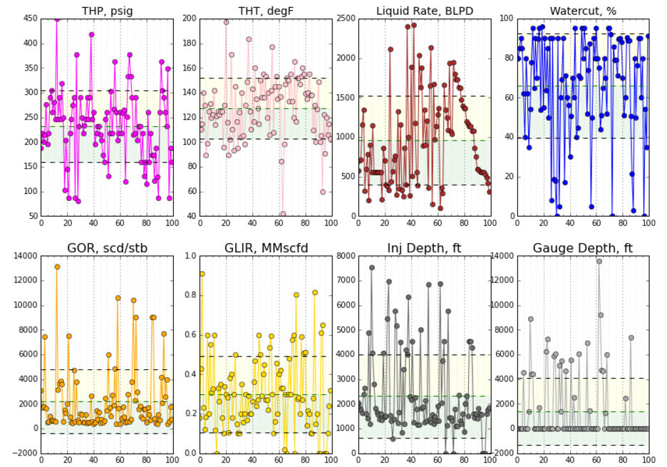 This other plot shows a boundary analysis of well tests that were marked as active in the model. We are trying to catch statistically any data point that is totally out of range. We call them outliers.