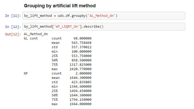 From the data we can say that the biggest producers are wells producing by gas lift with an average of 944 blpd, a maximum of 2421 blpd in a total of 98 wells. The lowest producer is at 100 blpd. In next posts I will showing simple Python and pandas scripts for production engineering.