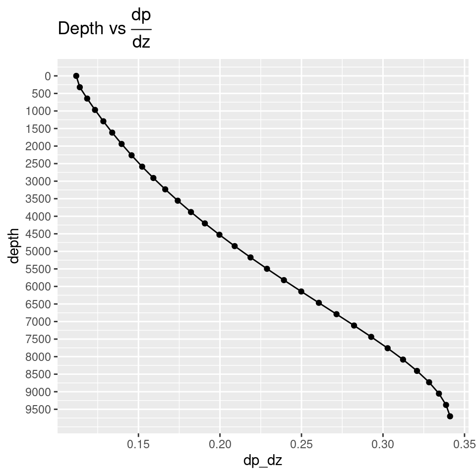 geom_point() + labs(title = TeX("Depth vs $\\frac{dp}{dz}$"))