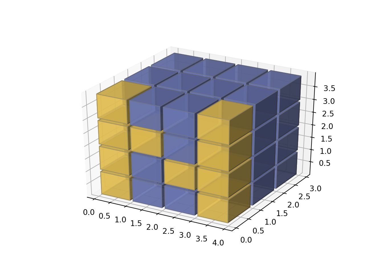 #> {(0, 0, 0): <mpl_toolkits.mplot3d.art3d.Poly3DCollection object at 0x7fe9bc400370>, (0, 0, 2): <mpl_toolkits.mplot3d.art3d.Poly3DCollection object at 0x7fe9bc400580>, (0, 0, 4): <mpl_toolkits.mplot3d.art3d.Poly3DCollection object at 0x7fe9bc4007f0>, (0, 0, 6): <mpl_toolkits.mplot3d.art3d.Poly3DCollection object at 0x7fe9bc400a30>, (0, 2, 0): <mpl_toolkits.mplot3d.art3d.Poly3DCollection object at 0x7fe9bc400ca0>, (0, 2, 2): <mpl_toolkits.mplot3d.art3d.Poly3DCollection object at 0x7fe9bc400f10>, (0, 2, 4): <mpl_toolkits.mplot3d.art3d.Poly3DCollection object at 0x7fe9bc3981c0>, (0, 2, 6): <mpl_toolkits.mplot3d.art3d.Poly3DCollection object at 0x7fe9bc398430>, (0, 4, 0): <mpl_toolkits.mplot3d.art3d.Poly3DCollection object at 0x7fe9bc3986d0>, (0, 4, 2): <mpl_toolkits.mplot3d.art3d.Poly3DCollection object at 0x7fe9bc398940>, (0, 4, 4): <mpl_toolkits.mplot3d.art3d.Poly3DCollection object at 0x7fe9bc398bb0>, (0, 4, 6): <mpl_toolkits.mplot3d.art3d.Poly3DCollection object at 0x7fe9bc398e20>, (2, 0, 0): <mpl_toolkits.mplot3d.art3d.Poly3DCollection object at 0x7fe9bc398fd0>, (2, 0, 2): <mpl_toolkits.mplot3d.art3d.Poly3DCollection object at 0x7fe9bc3a8370>, (2, 0, 4): <mpl_toolkits.mplot3d.art3d.Poly3DCollection object at 0x7fe9bc3a8610>, (2, 0, 6): <mpl_toolkits.mplot3d.art3d.Poly3DCollection object at 0x7fe9bc3a8880>, (2, 2, 0): <mpl_toolkits.mplot3d.art3d.Poly3DCollection object at 0x7fe9bc3a8af0>, (2, 2, 2): <mpl_toolkits.mplot3d.art3d.Poly3DCollection object at 0x7fe9bc3a8d60>, (2, 2, 4): <mpl_toolkits.mplot3d.art3d.Poly3DCollection object at 0x7fe9bc3a8fd0>, (2, 2, 6): <mpl_toolkits.mplot3d.art3d.Poly3DCollection object at 0x7fe9bc3ba280>, (2, 4, 0): <mpl_toolkits.mplot3d.art3d.Poly3DCollection object at 0x7fe9bc3ba4f0>, (2, 4, 2): <mpl_toolkits.mplot3d.art3d.Poly3DCollection object at 0x7fe9bc3ba760>, (2, 4, 4): <mpl_toolkits.mplot3d.art3d.Poly3DCollection object at 0x7fe9bc3ba9d0>, (2, 4, 6): <mpl_toolkits.mplot3d.art3d.Poly3DCollection object at 0x7fe9bc3bac40>, (4, 0, 0): <mpl_toolkits.mplot3d.art3d.Poly3DCollection object at 0x7fe9bc3baee0>, (4, 0, 2): <mpl_toolkits.mplot3d.art3d.Poly3DCollection object at 0x7fe9bc34b190>, (4, 0, 4): <mpl_toolkits.mplot3d.art3d.Poly3DCollection object at 0x7fe9bc34b400>, (4, 0, 6): <mpl_toolkits.mplot3d.art3d.Poly3DCollection object at 0x7fe9bc34b670>, (4, 2, 0): <mpl_toolkits.mplot3d.art3d.Poly3DCollection object at 0x7fe9bc34b8e0>, (4, 2, 2): <mpl_toolkits.mplot3d.art3d.Poly3DCollection object at 0x7fe9bc34bb50>, (4, 2, 4): <mpl_toolkits.mplot3d.art3d.Poly3DCollection object at 0x7fe9bc34bdc0>, (4, 2, 6): <mpl_toolkits.mplot3d.art3d.Poly3DCollection object at 0x7fe9bc34bf70>, (4, 4, 0): <mpl_toolkits.mplot3d.art3d.Poly3DCollection object at 0x7fe9bc3582e0>, (4, 4, 2): <mpl_toolkits.mplot3d.art3d.Poly3DCollection object at 0x7fe9bc358550>, (4, 4, 4): <mpl_toolkits.mplot3d.art3d.Poly3DCollection object at 0x7fe9bc3587c0>, (4, 4, 6): <mpl_toolkits.mplot3d.art3d.Poly3DCollection object at 0x7fe9bc358a30>, (6, 0, 0): <mpl_toolkits.mplot3d.art3d.Poly3DCollection object at 0x7fe9bc358ca0>, (6, 0, 2): <mpl_toolkits.mplot3d.art3d.Poly3DCollection object at 0x7fe9bc358f10>, (6, 0, 4): <mpl_toolkits.mplot3d.art3d.Poly3DCollection object at 0x7fe9bc36b1c0>, (6, 0, 6): <mpl_toolkits.mplot3d.art3d.Poly3DCollection object at 0x7fe9bc36b430>, (6, 2, 0): <mpl_toolkits.mplot3d.art3d.Poly3DCollection object at 0x7fe9bc36b6a0>, (6, 2, 2): <mpl_toolkits.mplot3d.art3d.Poly3DCollection object at 0x7fe9bc36b910>, (6, 2, 4): <mpl_toolkits.mplot3d.art3d.Poly3DCollection object at 0x7fe9bc36bb80>, (6, 2, 6): <mpl_toolkits.mplot3d.art3d.Poly3DCollection object at 0x7fe9bc36bdf0>, (6, 4, 0): <mpl_toolkits.mplot3d.art3d.Poly3DCollection object at 0x7fe9bc36bfa0>, (6, 4, 2): <mpl_toolkits.mplot3d.art3d.Poly3DCollection object at 0x7fe9bc37a310>, (6, 4, 4): <mpl_toolkits.mplot3d.art3d.Poly3DCollection object at 0x7fe9bc37a580>, (6, 4, 6): <mpl_toolkits.mplot3d.art3d.Poly3DCollection object at 0x7fe9bc37a7f0>}